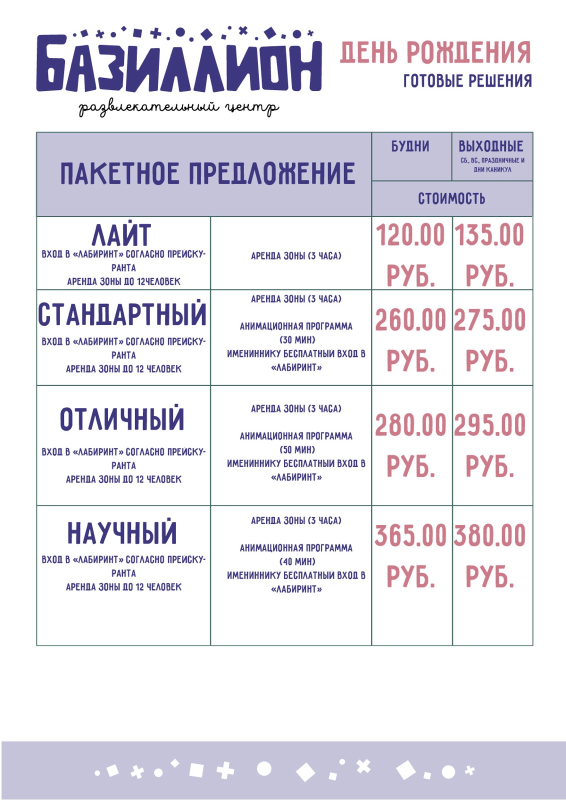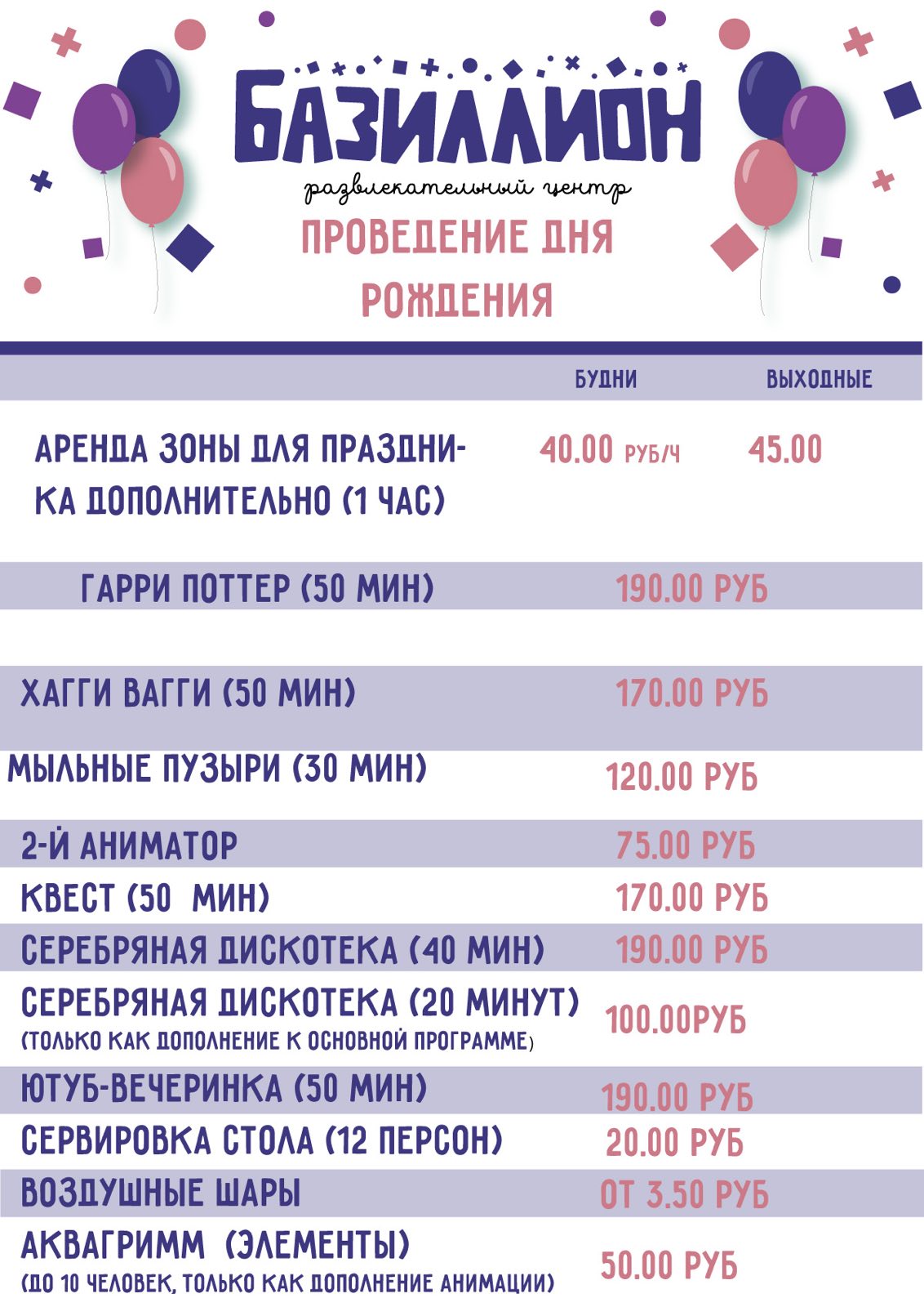 Все цены носят информационный характер. Точную стоимость услуг и товаров, пожалуйста, уточняйте у администраторов ДРЦ "Базиллион"