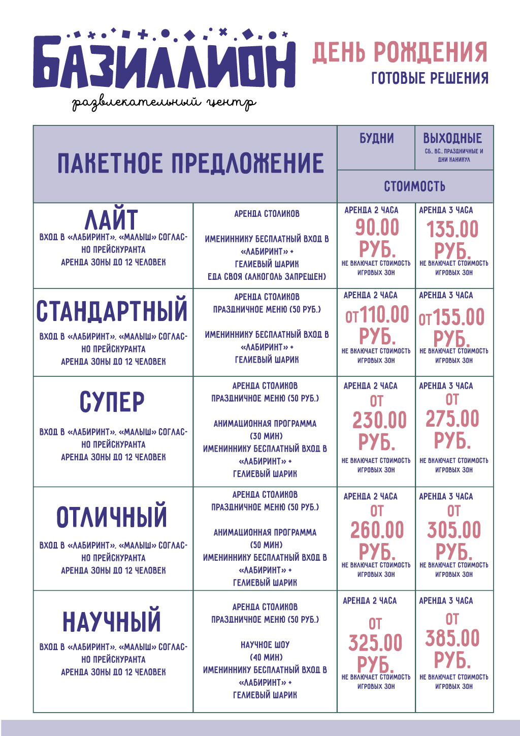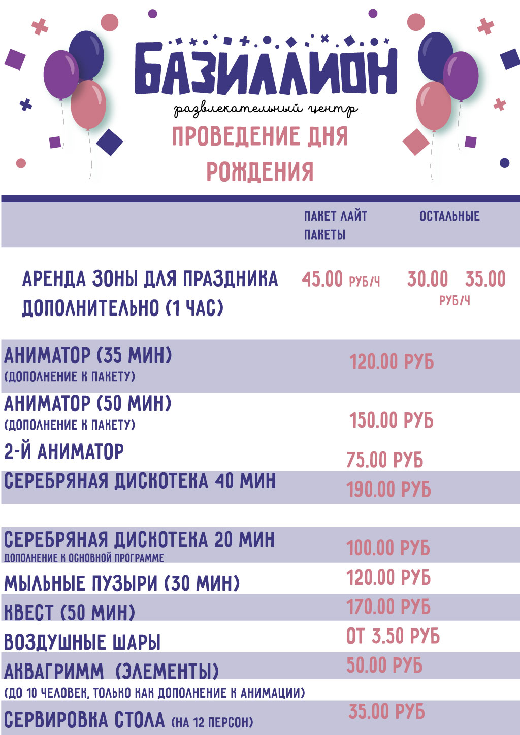 Все цены носят информационный характер. Точную стоимость услуг и товаров, пожалуйста, уточняйте у администраторов ДРЦ "Базиллион"